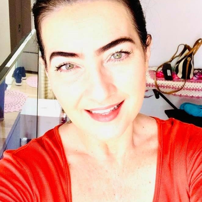 Mulher, de olhos claros, vestindo vermelho